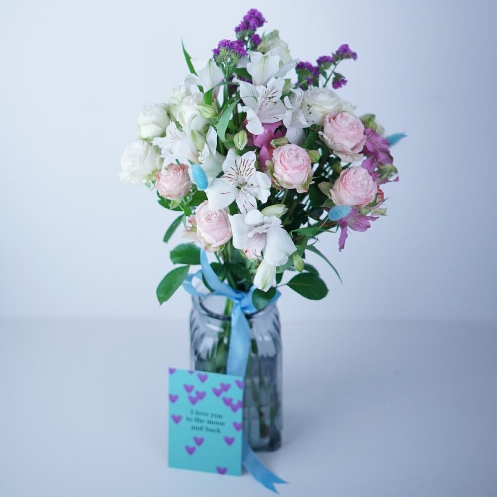 Гвоздики, Лизиантусы, Розы, Тюльпаны