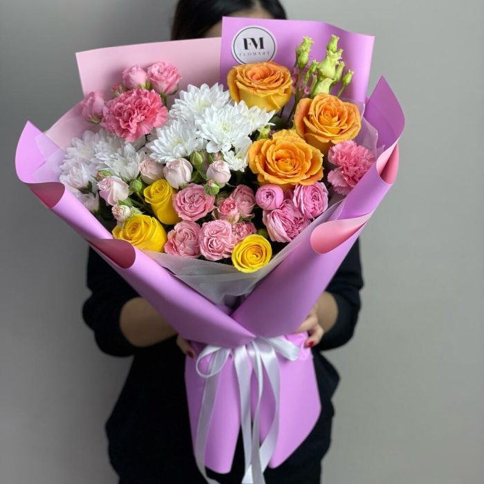 Эустома – 1 шт. Кустовая роза – 4 шт. Гвоздика – 2 шт. Роза – 6 шт. Хризантема кустовая – 2 шт. Упаковка – 1 шт.