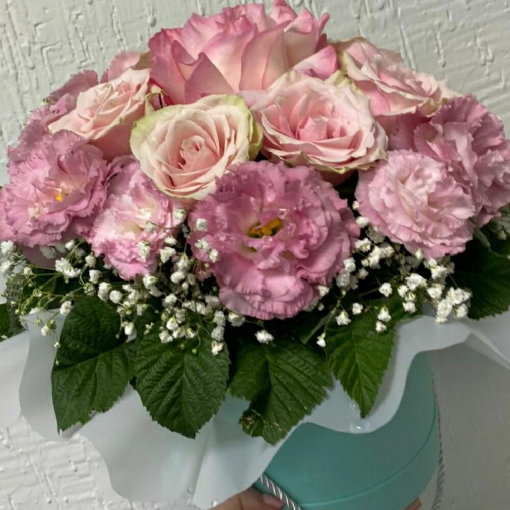 Гипсофила – 2 шт. Роза розовая – 7 шт. Лизиантус розовый – 5 шт.