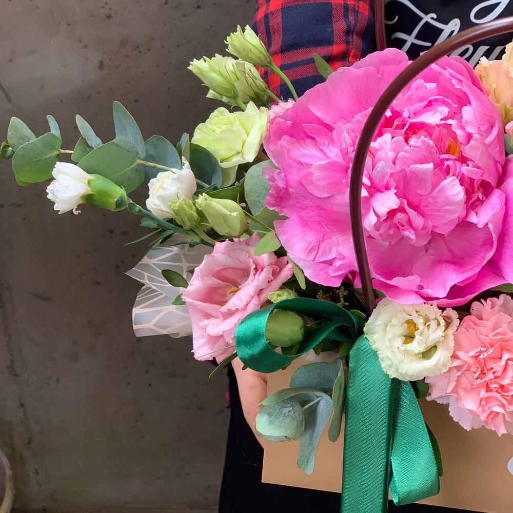 Крафт упаковка – 1 шт.Оазис флористический – 1 шт.Игрушка ручной работы – 1 шт.Пион – 1 шт.Роза – 1 шт.Гвоздика – 3 шт.Оксипеталум – 1 шт.Роза кустовая – 1 шт.зелень декоративная – 2 шт.Лента атласная – 1 шт.