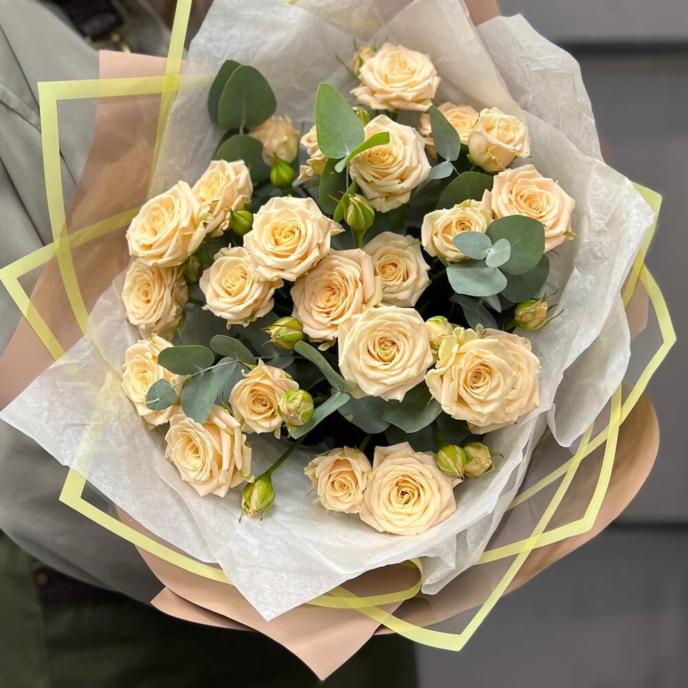 Эвкалипт – 3 шт.Лента атласная – 2 шт.Пленка матовая – 4 шт.Тишью белое – 3 шт.роза кустовая таня – 5 шт.пленка дизайнерская с каймой – 2 шт.