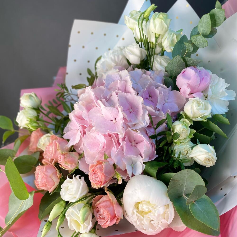 Роза кустовая – 3 шт.Роза – 3 шт.Диантус – 3 шт.Упаковка дизайнерская – 1 шт.Гортензия розовая – 1 шт.Эвкалипт Микс – 1 шт.эустома белая – 2 шт.зелень декоративная – 3 шт.