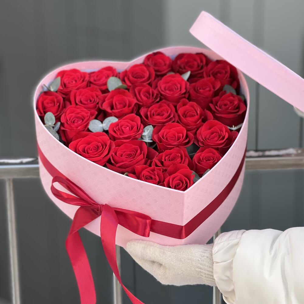 красные розы – 25 шт. Эвкалипт – 1 шт. Коробка – 1 шт. Оазис – 3 шт.
