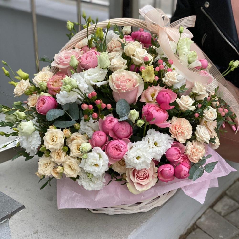 Эустома – 10 шт. роза розовая пинк мондиаль – 9 шт. Эвкалипт – 3 шт. Гиперикум – 5 шт. Гвоздика – 7 шт. кустовая роза таня – 5 шт. кустовая роза роял порцелина – 5 шт. кустовая пионовидная роза сильвия пинк – 8 шт. Корзина – 1 шт. Оазис – 6 шт. Оформление – 1 шт.