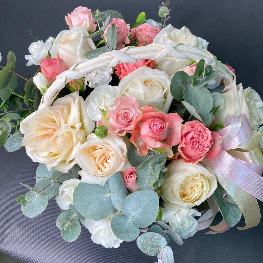Корзина пион роз, диантуса и эвкалипта «Бал цветов»