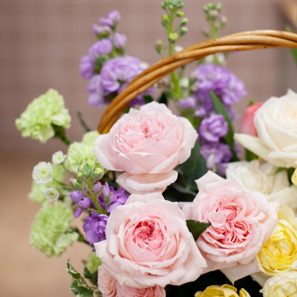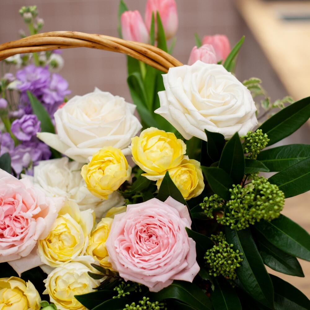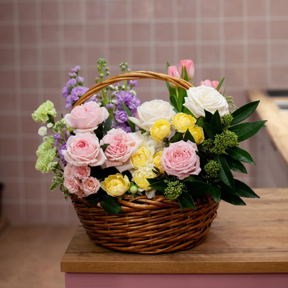 Пионовидная роза – 6 шт.Пионовидная кустовая роза – 3 шт.Диантус – 5 шт.Скиммия – 5 шт.Тюльпан – 6 шт.Маттиола – 4 шт.Хризантема кустовая – 3 шт.Зелень – 6 шт.Корзина плетеная – 1 шт.