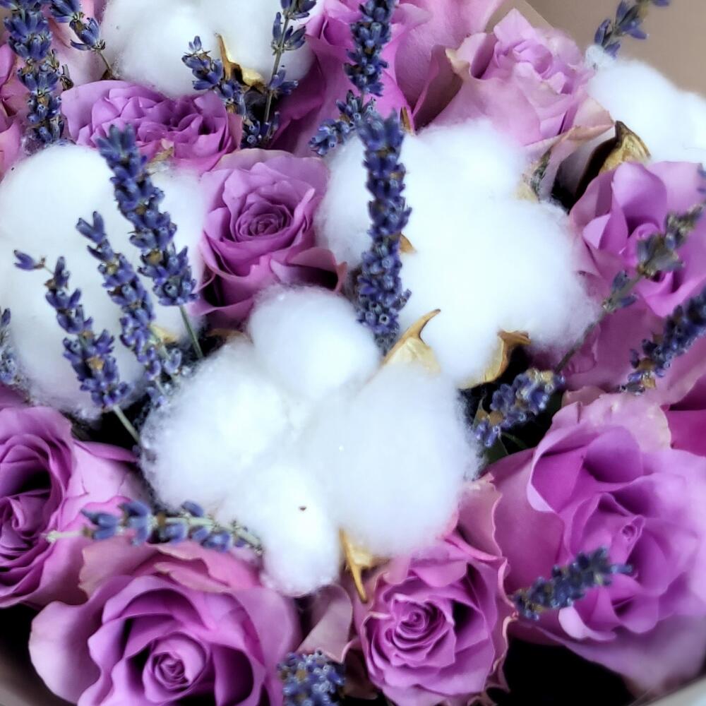 Лаванда – 25 шт.Хлопок – 5 шт.Роза Кенийская – 15 шт.Упаковка дизайнерская – 1 шт.
