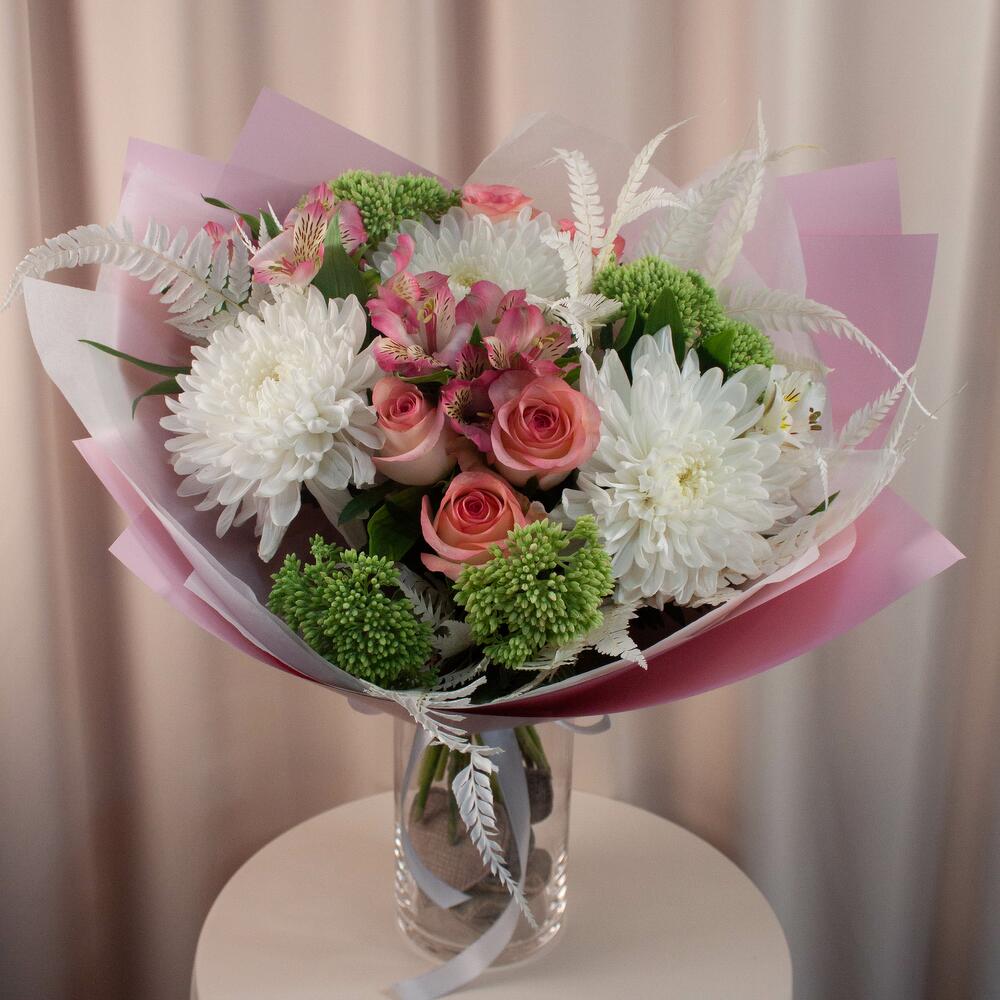 Альстромерия – 3 шт. Папоротник – 2 шт. Роза – 5 шт. Хризантема – 3 шт. Седум – 5 шт. Оформление – 1 шт.
