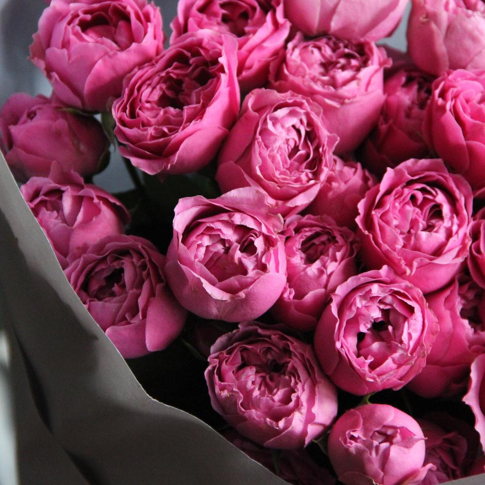 Роза пионовидная кустовая – 7 шт.Упаковка – 2 шт.Лента атласная – 2 шт.