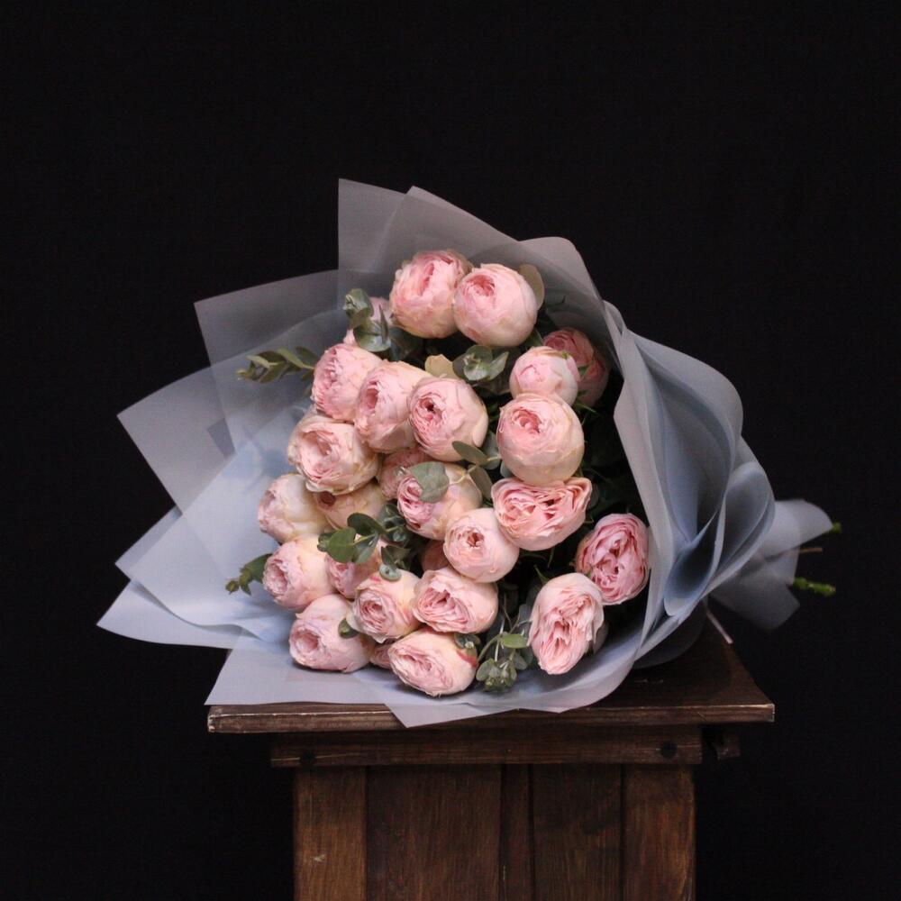 mono bouquet 94 из 7 Пионовидных кустовых роз Mansfield Park + эвкалипт
