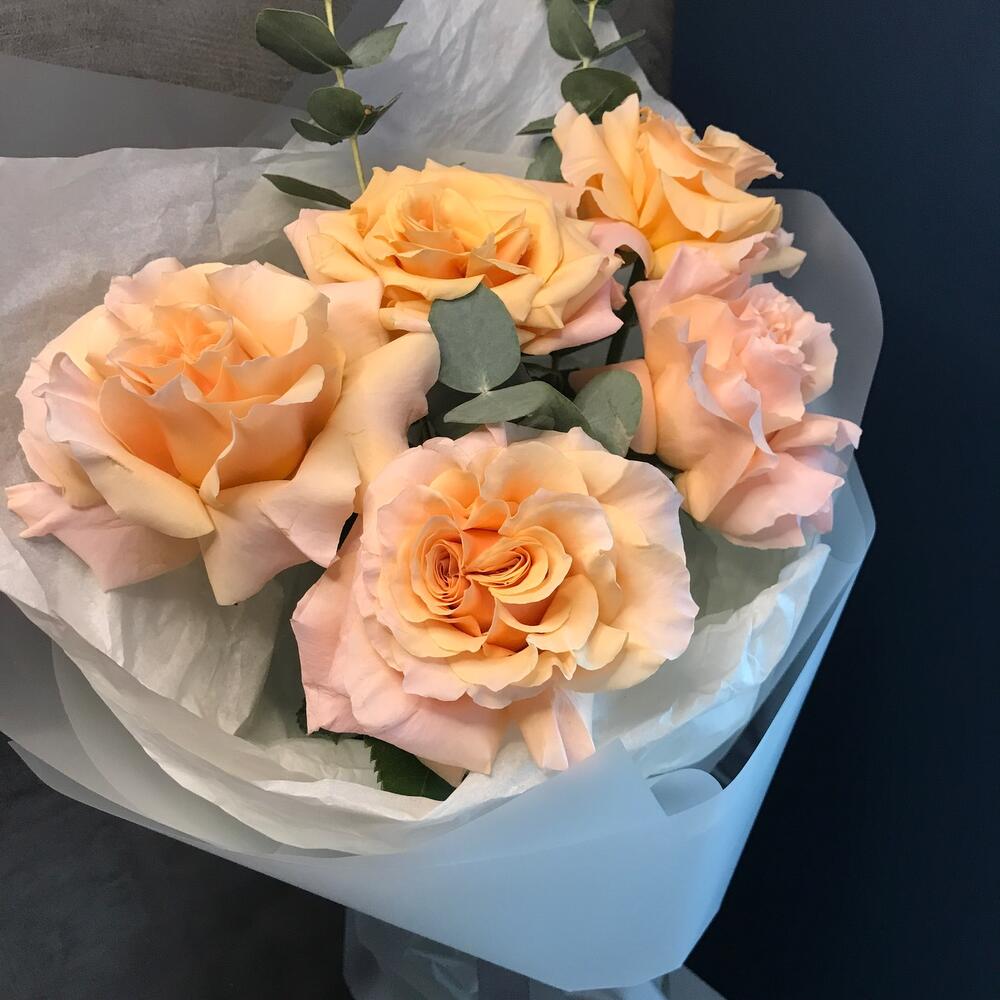 Лента – 1 шт.Эвкалипт – 2 шт.Тишью – 2 шт.Французская роза – 5 шт.Пленка матовая – 1 шт.Средство для продления жизни цветов – 1 шт.
