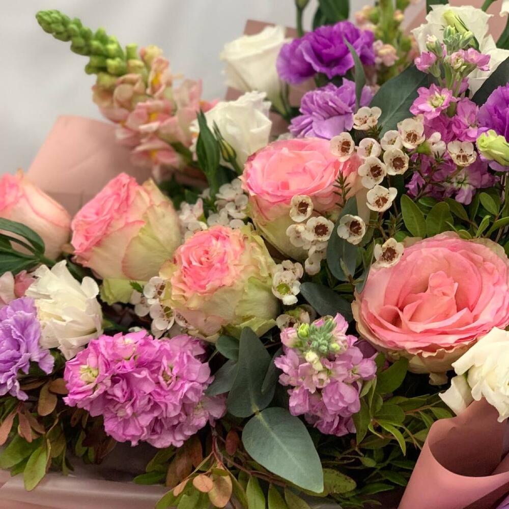 антиринум – 3 шт.Диантус – 4 шт.Роза Эквадор – 5 шт.Лизиантус – 3 шт.Фисташка – 6 шт.Эвкалипт – 6 шт.Ваксфлауэр – 2 шт.Маттиола – 3 шт.Упаковка дизайнерская – 2 шт.