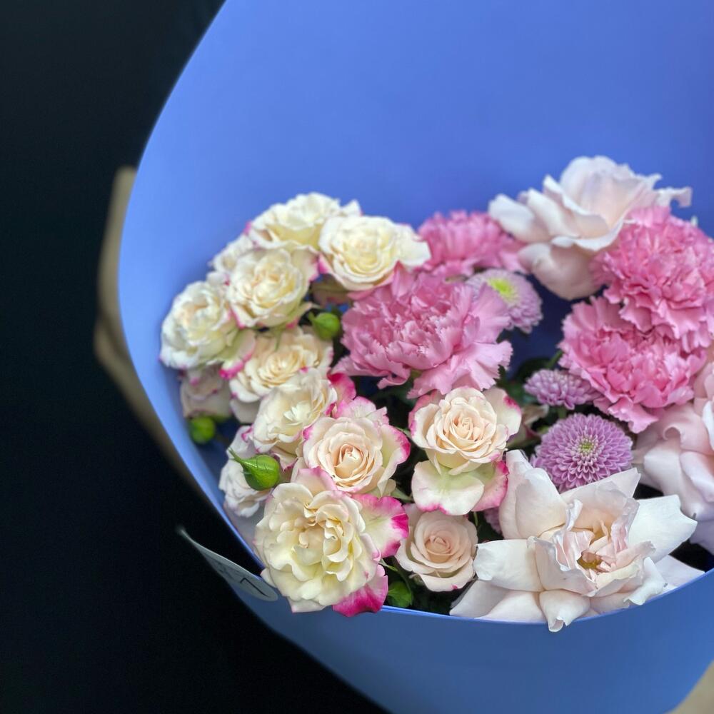 Кустовая роза – 3 шт.Роза Эквадор – 3 шт.Гвоздика – 4 шт.Лента атласная – 2 шт.Сантини – 2 шт.Фоамиран (упаковка) – 1 шт.