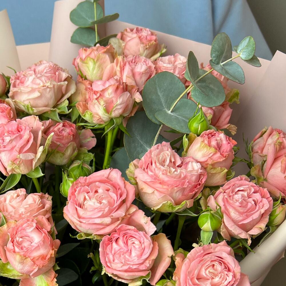 Эвкалипт – 2 шт.Кустовая пионовидная роза – 5 шт.Упаковка дизайнерская – 1 шт.комплимент от polyanka – 1 шт.
