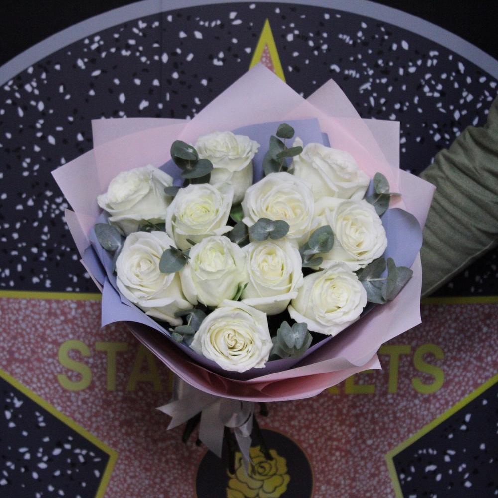 Эвкалипт – 3 шт.Лента атласная – 2 шт.Роза пионовидная – 11 шт.Пленка дизайнерская – 4 шт.