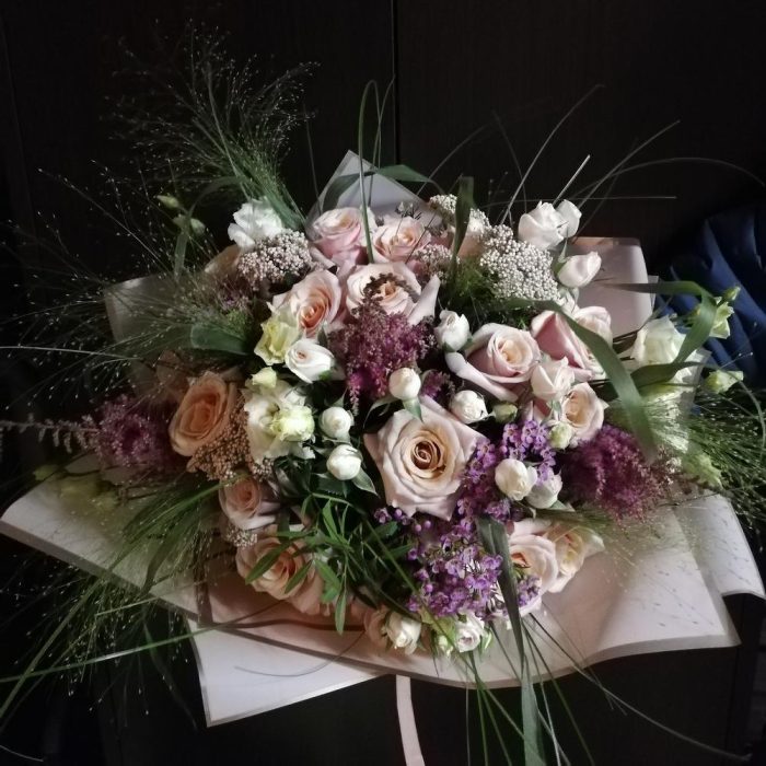 Ваксфлауэр – 6 шт. Вероника – 3 шт. Калла – 3 шт. Роза кустовая – 5 шт. Роза – 17 шт. Гвоздика – 3 шт. Берграсс – 6 шт. Паникум Фонтан – 4 шт. Оформление – 1 шт. Астильба Европа – 3 шт. Лизиантус – 4 шт.