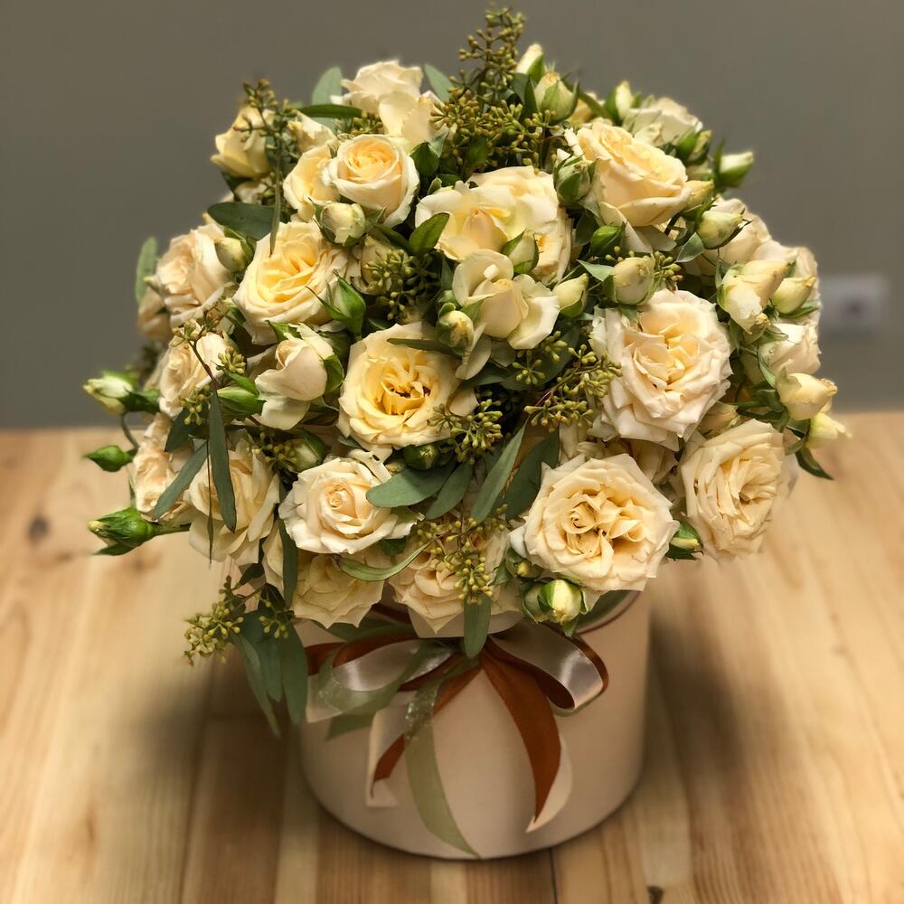 Роза кустовая – 11 шт.Эвкалипт – 3 шт.Шляпная коробка с лентами – 1 шт.Оазис флористический – 1 шт.Упаковка дизайнерская – 1 шт.