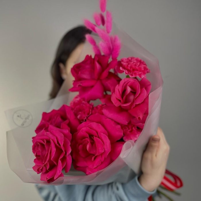 Множество малиновых оттенков в одном букете.Ароматные Розы Пинк Флойд в перемешку с гвоздиками и пушистым лагурусом. Мы используем для создания наших букетиков только качественный и свежий цветок Создаем букеты с невероятной любовью К букетику мы всегда прилагаем подкормку для цветочков – «chrysal”, чтобы они дольше сохраняли свою свежесть и красоту а также «Советы флористов» по уходу за срезанными цветочками Дополнительно к букетику Вы можете приобрести аквабоксы, транспортировочные коробки, крафтовые пакеты и вазы нужного размера