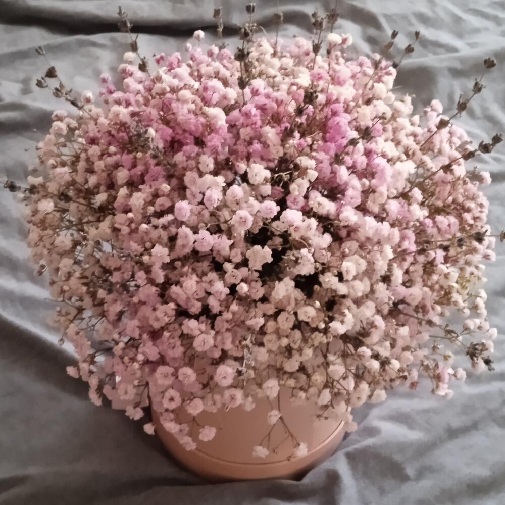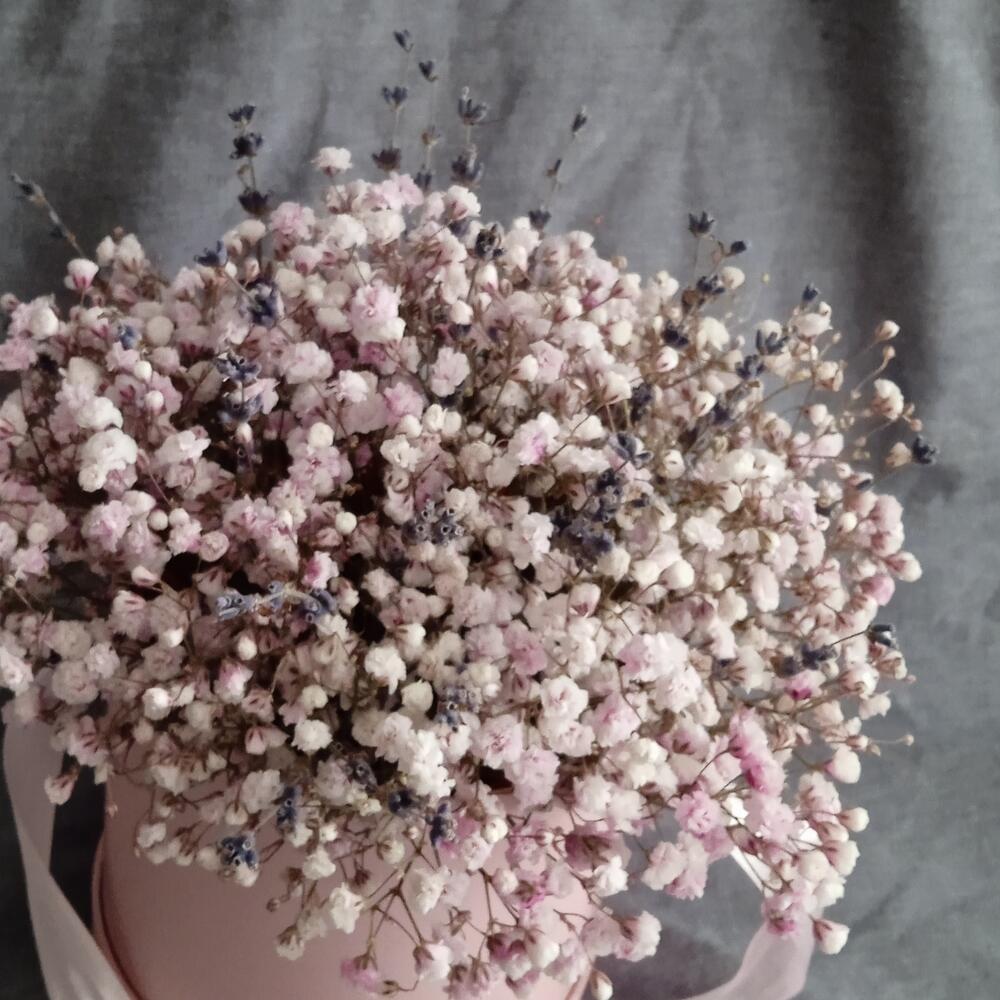 Гипсофила розовая с лавандой в шляпной коробке