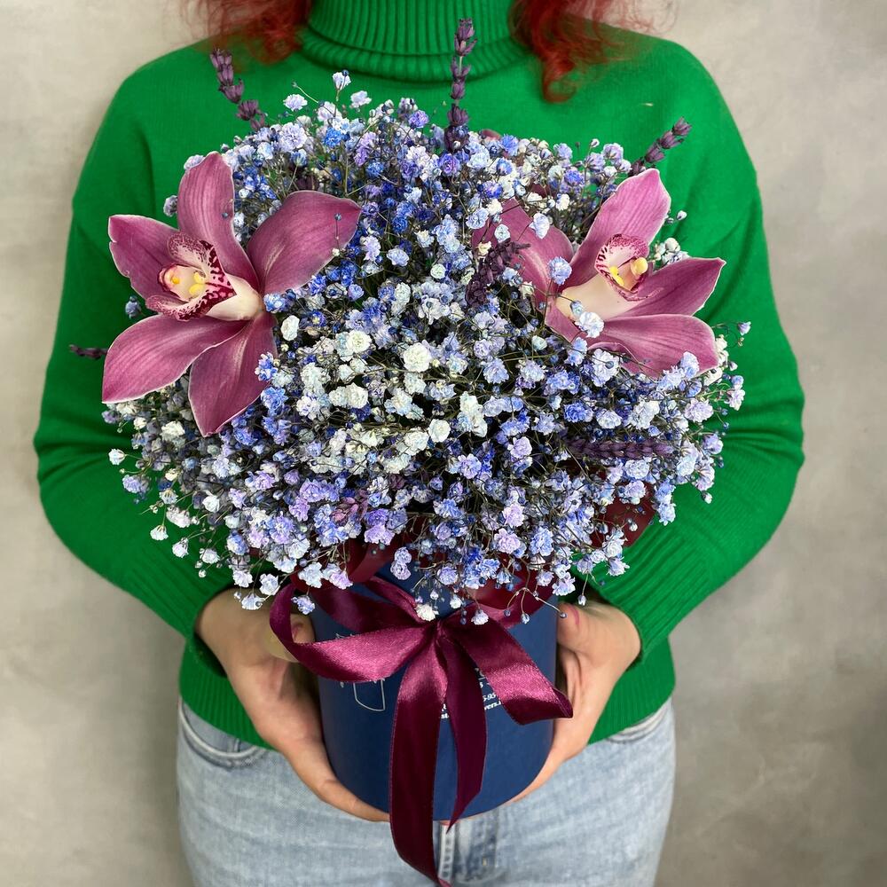 Гипсофила – 6 шт.Коробка шляпная – 1 шт.орхидея – 3 шт.Лагурус – 11 шт.Оазис флористический – 1 шт.